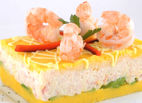Causa c/ pulpa de cangrejo y langostinos